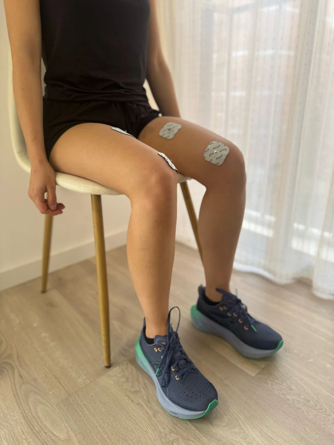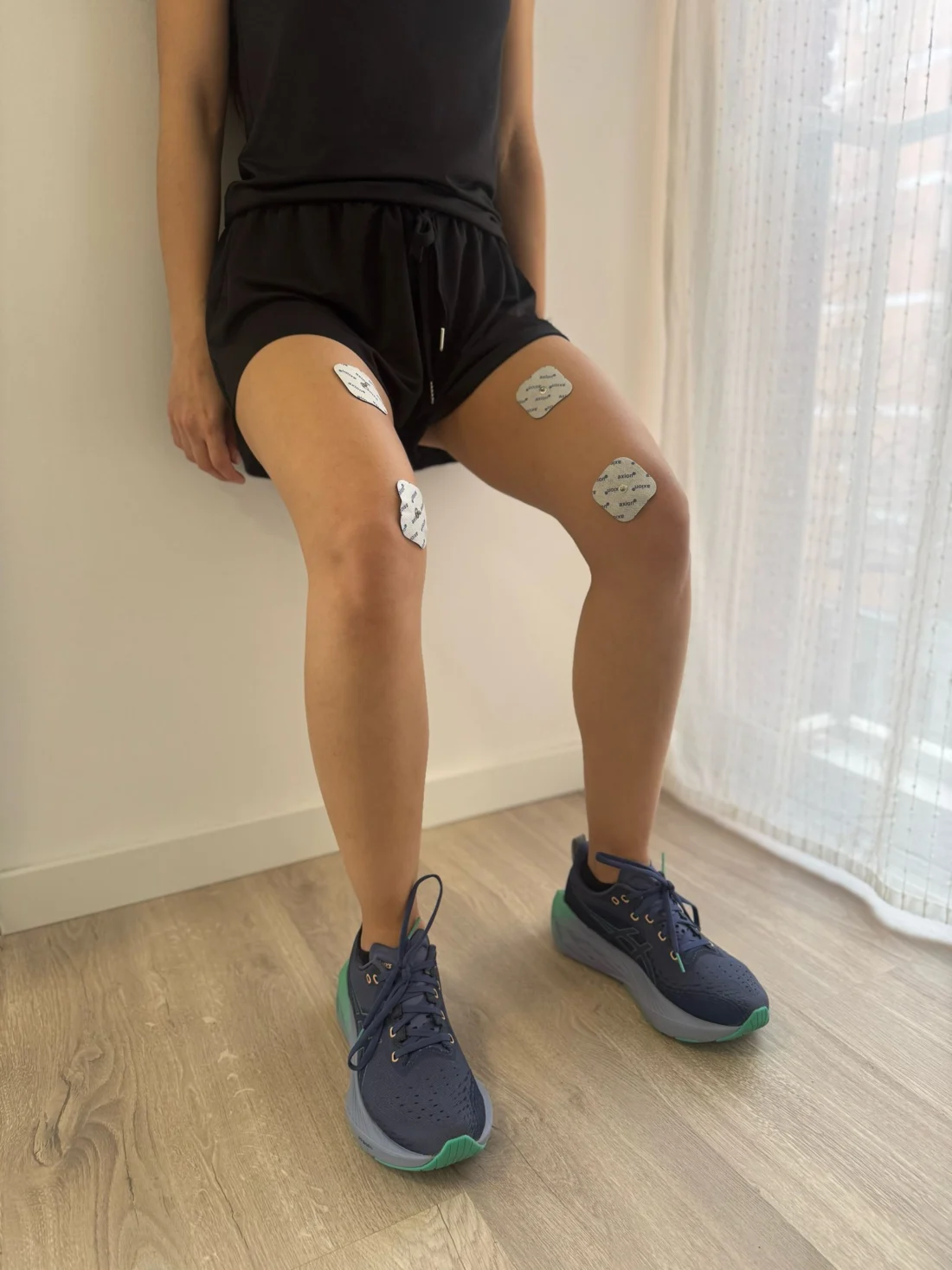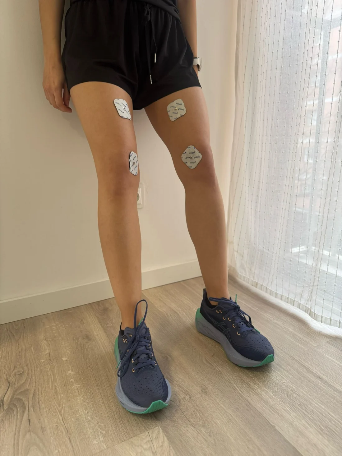 Cuando logres activar el vasto medial, te darás cuenta que al hacer un squat o una extensión, te duele menos la rodilla y que te sientes más seguro/a. Pruébalo a la vez que haces una sesión de EMS con los electrodos puestos como te propongo, tal como se ve en las imágenes: