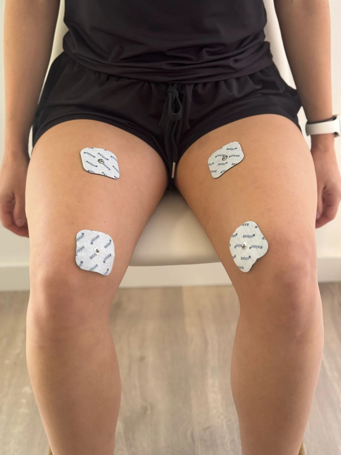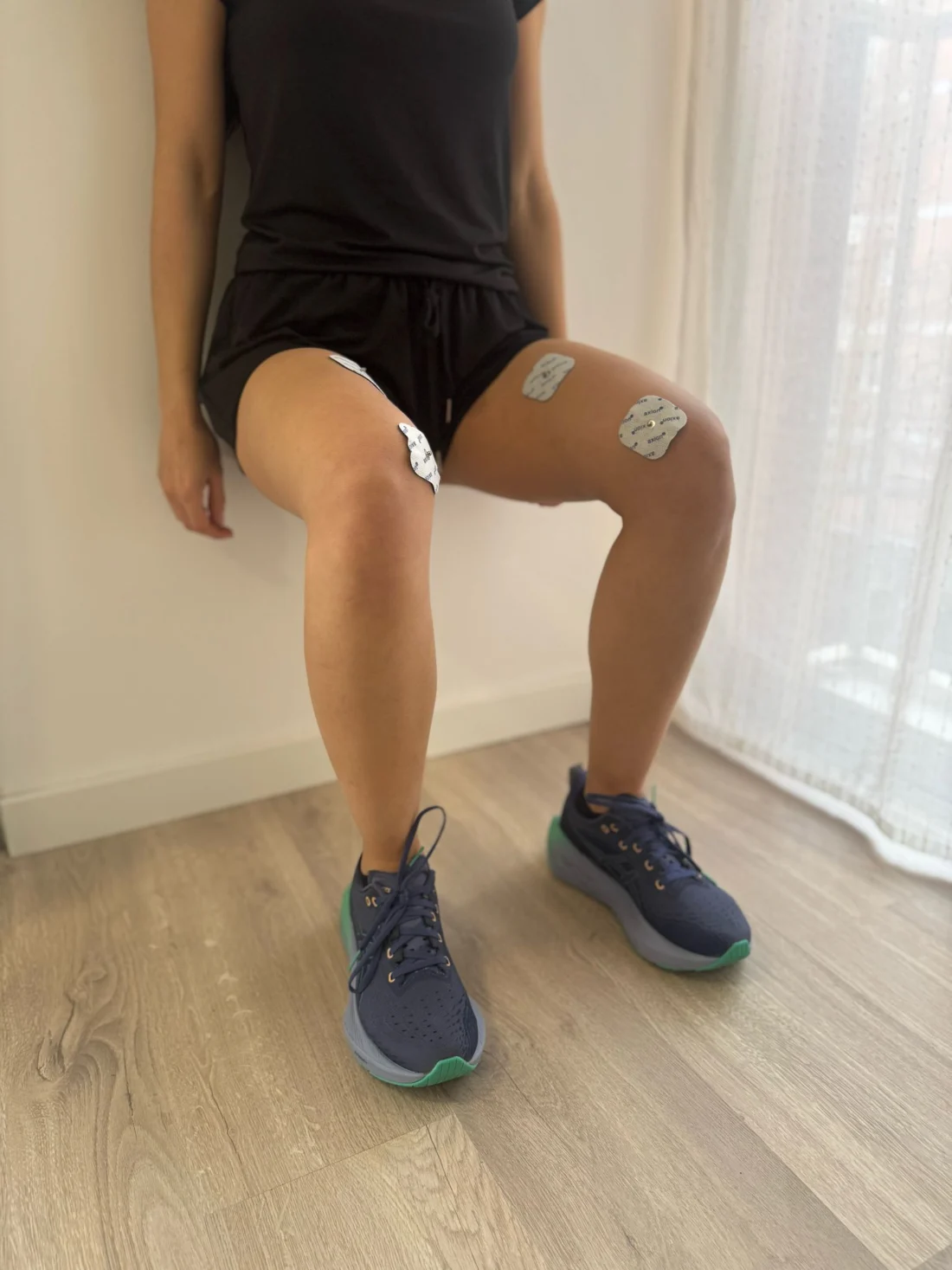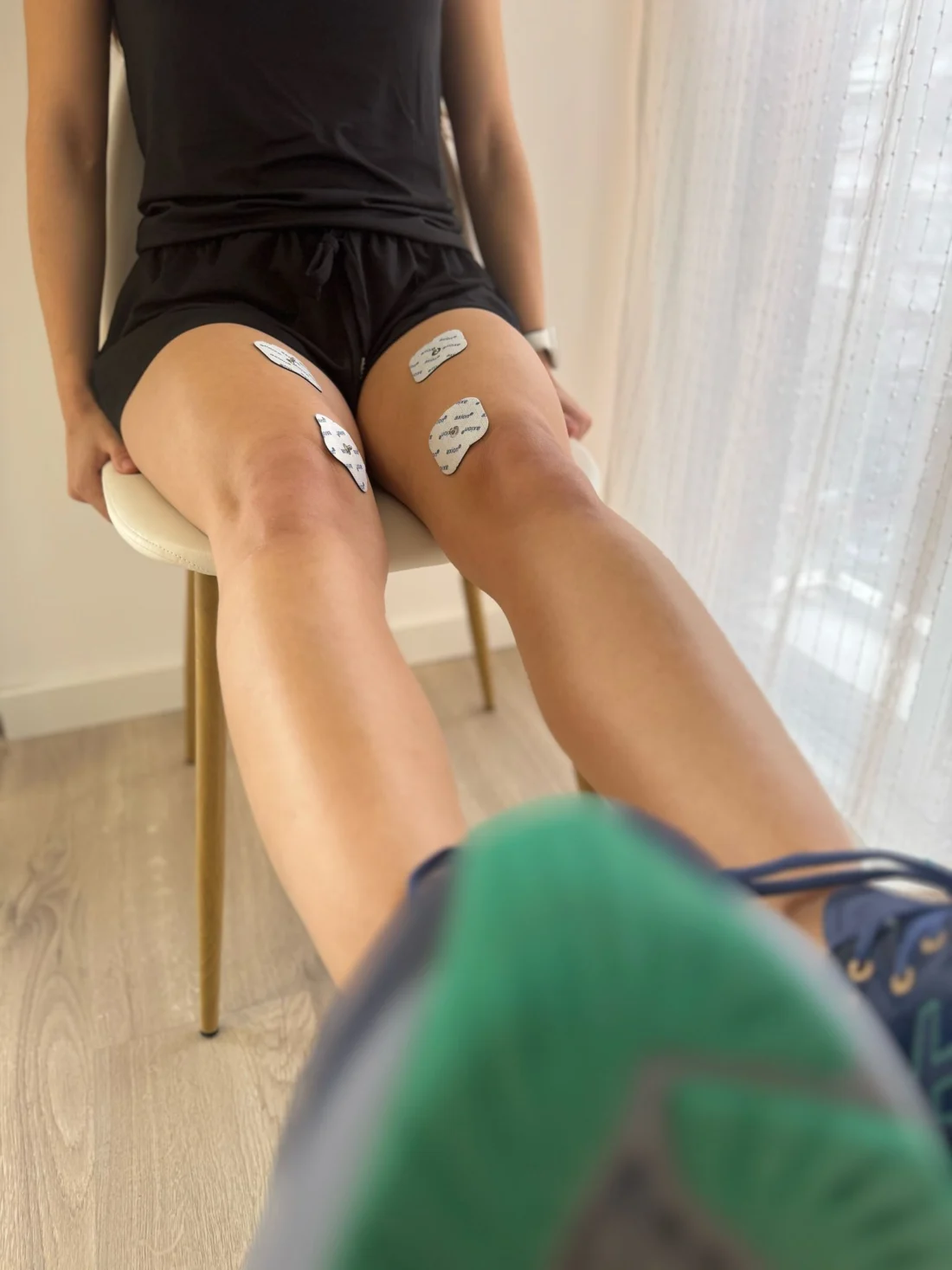 Cuando logres activar el vasto medial, te darás cuenta que al hacer un squat o una extensión, te duele menos la rodilla y que te sientes más seguro/a. Pruébalo a la vez que haces una sesión de EMS con los electrodos puestos como te propongo, tal como se ve en las imágenes: